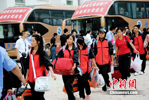 記者在現(xiàn)場看到,26輛豪華大巴分兩排停放在車場,1000多名學(xué)生身穿紅、藍兩種不同顏色校服,提著行李在老師和志愿者的幫助下排隊上車,從他們的表情中不難看出有幾分興奮與幾分憂傷,因為在他們當(dāng)中,很多孩子還沒有離開過父母、離開過舟曲。一些家長淚流滿面依依不舍的送別孩子,并叮囑他們好好學(xué)習(xí)。
