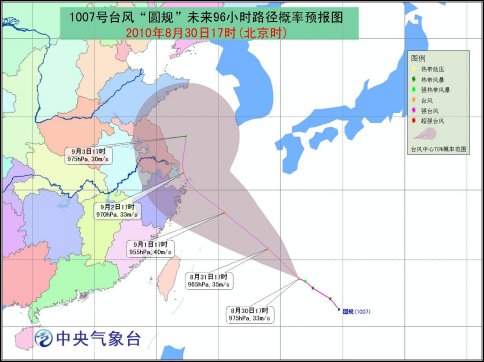 預(yù)計(jì),“圓規(guī)” 將以每小時(shí)15公里左右的速度向西北方向移動(dòng),強(qiáng)度還將繼續(xù)加強(qiáng),將于9月1日白天進(jìn)入東海南部海面,以后逐漸向浙江中部到江蘇中部一帶沿?拷。30日晚上至31日白天,“圓規(guī)”對我國近海無影響。