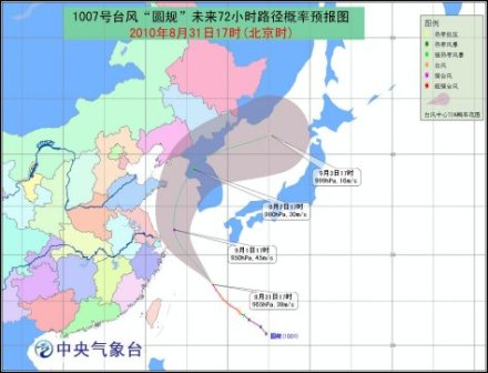 預(yù)計,“圓規(guī)” 將以每小時30公里左右的速度向西北方向移動,強度還將略有加強,將于31日晚上進入東海東南部海面,以后逐漸向浙江北部到江蘇南部一帶沿?拷,并有可能于9月1日白天擦過這一帶沿海北上。