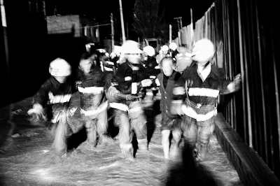 22時(shí)45分,所調(diào)集的東崗中隊(duì)一臺(tái)照明車正趕往現(xiàn)場。23時(shí)33分,特勤一中隊(duì)7名戰(zhàn)斗員到達(dá)現(xiàn)場。由于道路房屋都被泥水淹沒,給救援工作帶來了很大的困難。官兵們手抓大繩,走在齊腰深的淤泥中,一步一步到達(dá)現(xiàn)場后,發(fā)現(xiàn)多名群眾被困在房里面。時(shí)間就是生命!中隊(duì)長周暉立即命令一中隊(duì)官兵迅速展開救援,由于泥水淹至膝蓋,所有官兵只能緩慢的靠近被困群眾,然后一個(gè)個(gè)攙扶的進(jìn)行轉(zhuǎn)移。