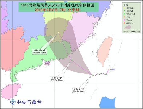 預計,風暴中心將以每小時10-15公里的速度向偏西方向移動,以后逐漸轉(zhuǎn)向西北方向移動,并向廣東東部到福建南部一帶沿?拷瑥姸戎饾u加強,將于9日夜間到10日上午在這一帶沿海登陸。