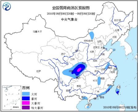 中新網(wǎng)9月8 日電 據(jù)中央氣象臺網(wǎng)站消息,中央氣象臺9月8日18時發(fā)布暴雨藍色預警:9月8日20時到9日20時,四川盆地、川西高原中部、甘肅東南部、陜西南部、重慶西部和北部、福建東南部沿海、廣東中東部沿海、臺灣中南部等地有大雨或暴雨,其中,四川盆地東北部局地有大暴雨。另外,內(nèi)蒙古中部、山東半島東部、蘇皖中部、江西西部、廣西東南部、海南南部等地的部分地區(qū)有大雨。上述局部地區(qū)并伴有短時雷雨大風或冰雹等強對流天氣。