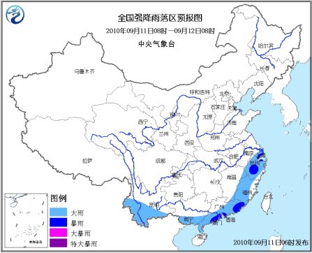 中新網(wǎng)9月11日電 據(jù)中央氣象臺網(wǎng)站消息,中央氣象臺9月11日06時繼續(xù)發(fā)布暴雨藍(lán)色預(yù)警:9月11日08時到12日08時,江蘇東南部、上海、浙江大部、江西東北部和東南部、福建大部、廣東中南部和東部、廣西南部、云南南部等地有大雨或暴雨;上述地區(qū)局部并伴有短時雷雨大風(fēng)等強對流天氣。