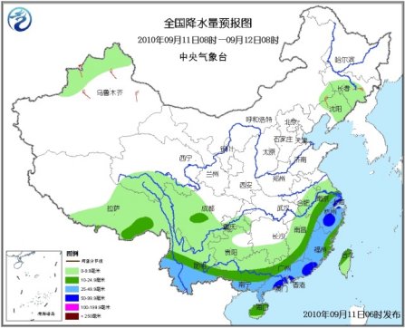 11日08時(shí)至12日08時(shí),新疆西北部、青海南部、西藏中東部、吉林南部、遼寧中北部、江淮大部、江南中東部和南部、華南以及西南地區(qū)大部有小到中雨或陣雨,其中,江蘇東南部、上海、浙江大部、江西東北部和東南部、福建大部、廣東中南部和東部、廣西南部、云南南部等地有大雨或暴雨;上述地區(qū)局部并伴有短時(shí)雷雨大風(fēng)或冰雹等強(qiáng)對(duì)流天氣。新疆北部、甘肅西部等地有4~6級(jí)風(fēng)。黃海南部海域、東海西部和北部海域?qū)⒂?~8級(jí)、陣風(fēng)9~10級(jí)大風(fēng)。