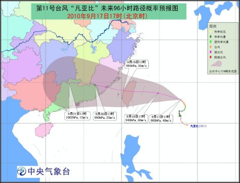 預(yù)計(jì),“凡亞比”中心將以每小時(shí)10-15公里的速度先向西偏北方向移動(dòng),以后逐漸轉(zhuǎn)向偏西方向移動(dòng),移速將略有加快,強(qiáng)度繼續(xù)加強(qiáng),并向我國(guó)臺(tái)灣東部一帶沿?拷,將于19日凌晨到白天在臺(tái)灣東部沿海登陸;之后,“凡亞比”將穿越臺(tái)灣島進(jìn)入臺(tái)灣海峽,向福建中部到廣東東部一帶沿海靠近。