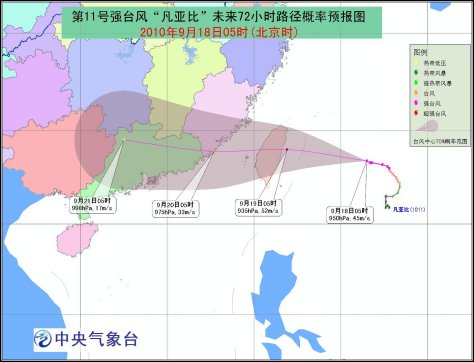 中新網(wǎng)9月18日電 中央氣象臺(tái)18日8時(shí)發(fā)布消息稱,今天,第11號(hào)強(qiáng)臺(tái)風(fēng)“凡亞比”將以每小時(shí)15~20公里的速度向臺(tái)灣沿海進(jìn)發(fā),強(qiáng)度繼續(xù)加強(qiáng),可能發(fā)展為超強(qiáng)臺(tái)風(fēng)。受其影響,臺(tái)灣和東南沿海將遭遇狂風(fēng)暴雨。中央氣象臺(tái)6時(shí)已經(jīng)發(fā)布臺(tái)風(fēng)紅色預(yù)警。
