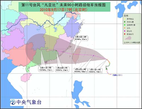 據(jù)中央氣象臺(tái)預(yù)計(jì),受“凡亞比”影響,中國(guó)東南海區(qū)將有狂風(fēng)。17日至21日,受其影響,臺(tái)灣以東洋面、東海南部、巴士海峽、巴林塘海峽、臺(tái)灣海峽、臺(tái)灣省及其沿海、福建東部及沿海、浙江東南部沿海、廣東東部沿海的風(fēng)力將逐漸加大到7~9級(jí),部分海域或地區(qū)的風(fēng)力可達(dá)10~12級(jí),“凡比亞”中心經(jīng)過(guò)的附近海面或地區(qū)的風(fēng)力有13~16級(jí)。