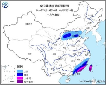 9月19日20時(shí)到20日20時(shí),福建大部、浙江南部、江西東南部、廣東中東部、臺(tái)灣等地將有大到暴雨,福建東南部、廣東東部、臺(tái)灣等地的部分地區(qū)有大暴雨,局地有特大暴雨。