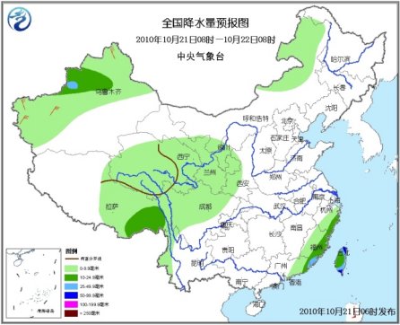 21日08時至22日08時,新疆北部和西部、西藏東部、青海大部、川西高原中北部、內蒙古東北部等地有小雨(雪)或雨夾雪;甘肅中東部、寧夏中南部、陜西西南部、四川盆地西北部、云南西北部、浙江東南部、福建大部、廣東東部、臺灣等地有小到中雨或陣雨,其中,福建東南部、臺灣等地有大雨,局地有暴雨;上述局部地區(qū)并伴有短時雷雨大風等強對流天氣。新疆北部、東南部沿海等地有4~6級風,新疆西北部山口地區(qū)風力可達8~9級。南海東北部海域的風力將有10~13級、陣風可達14~15級;“鲇魚”中心經過的附近海域的風力將有14~16級、陣風可達17級及以上;東海大部、臺灣海峽、南海西北部將有7~9級大風。
