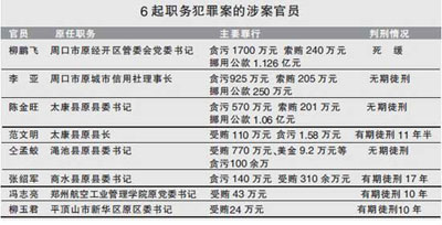 10月26日上午,省高院首次集中通報了近期宣判的6起在全省有重大影響的職務(wù)犯罪案。涉案的8個被告人中,有3個縣委書記,一個縣長,兩個區(qū)委書記,一個信用社理事長,一個高校黨委書記。涉案金額最高的上億元,最少的24萬元。其中3個人被判處無期徒刑和死緩。