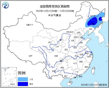 11月11日20時(shí)到12日20時(shí),內(nèi)蒙古東部偏南地區(qū)、遼寧北部、吉林大部、黑龍江東南部等地有大雪(5~9毫米),其中,內(nèi)蒙古東部偏南地區(qū)、吉林中部、黑龍江東南部等地的部分地區(qū)有暴雪(10~20毫米)。