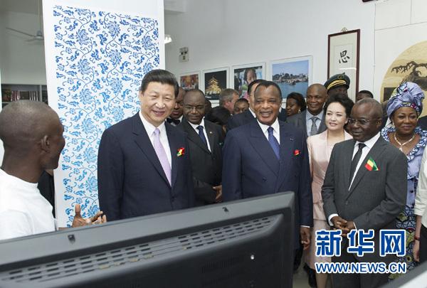 習近平和薩蘇共同為圖書館剪彩。隨后,兩國元首步入圖書館大廳,一同為圖書館和中國館揭牌。剛果高教部長莫揚代表師生發(fā)表講話,感謝中國為改善剛果教學條件提供的幫助。
