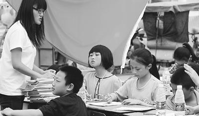 4月25日,蘆山縣地震災(zāi)區(qū)的孩子們在志愿者建立的臨時帳篷學校里補習功課。