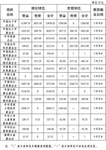 截至5月16日,中國紅十字會總會和14家在民政部登記的社會組織向民政部報送了救災捐贈統(tǒng)計數據。