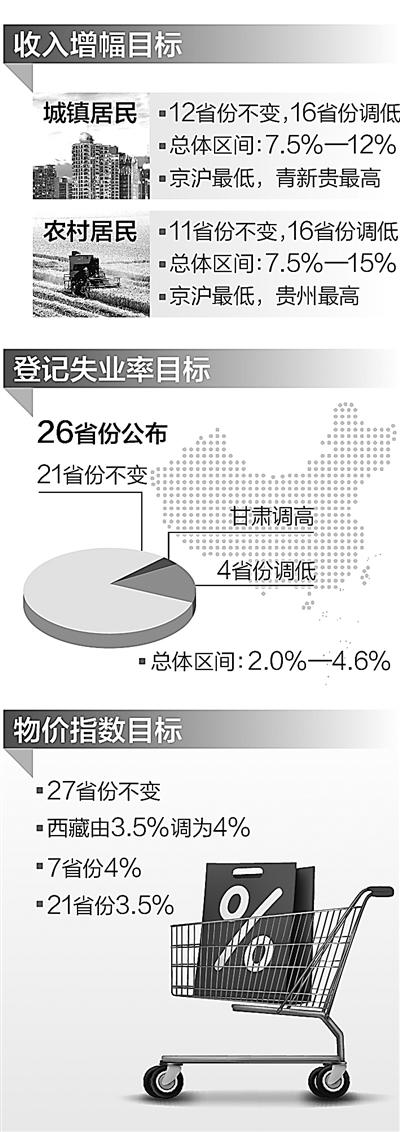截至1月23日,除了安徽、海南、湖南,全國共有28個省份召開兩會。梳理各地政府工作報告可以發(fā)現(xiàn),緊扣經(jīng)濟增長目標,各地居民收入、物價指數(shù)、登記失業(yè)率等指標也作了相應(yīng)調(diào)整。整體表現(xiàn)為:收入增幅目標調(diào)低,物價調(diào)控目標保持穩(wěn)定,登記失業(yè)率目標變化不大。