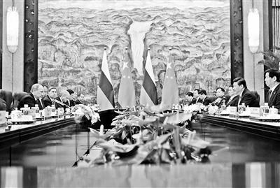 習(xí)近平指出,中俄合作是全方位、多層次的。雙方要再加把勁,努力實(shí)現(xiàn)2015年前雙邊貿(mào)易額達(dá)到1000億美元的目標(biāo)。對中俄務(wù)實(shí)合作,我們既推動(dòng)量的提升,也重視質(zhì)的跨越,通過建立中俄投資合作委員會(huì)、高級別專項(xiàng)小組等機(jī)制,推進(jìn)經(jīng)貿(mào)、投資、能源、高技術(shù)、航空航天、基礎(chǔ)設(shè)施建設(shè)、民生等領(lǐng)域戰(zhàn)略性大項(xiàng)目合作。要對接絲綢之路經(jīng)濟(jì)帶和俄羅斯跨歐亞鐵路建設(shè),拉動(dòng)兩國經(jīng)貿(mào)往來和毗鄰地區(qū)開發(fā)開放,共享歐亞大通道和歐亞大市場。