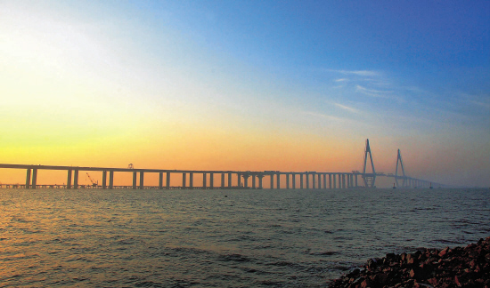 呈“S”形的杭州灣跨海大橋全長(zhǎng)三十六公里,海上段長(zhǎng)度三十二公里,北起浙江嘉興市海鹽鄭家埭,跨越喇叭口狀的杭州灣后,止于浙江寧波市慈溪水路灣。
