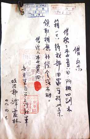記者看到,那張譚震林親筆書寫的借條上記載了華東軍區(qū)第三野戰(zhàn)軍向普通船工李貴田借用門板四副、木箱一只的史實,并特別注明,待軍隊回還,李貴田可領(lǐng)取相應(yīng)補償金或木材。