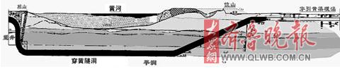 在車上,傅總工給記者畫(huà)了一張隧洞的示意圖。記者看到,黃河隧洞由斜洞、平洞、豎洞三個(gè)部分組成。其中,入口是一個(gè)豎洞,從江蘇揚(yáng)州即長(zhǎng)江下游抽引而來(lái)的長(zhǎng)江水,經(jīng)過(guò)一路奔波,就從這里入洞。和豎洞底部相連接的,是一個(gè)平洞,位于黃河河床下70米的位置,長(zhǎng)江水從豎洞飛流直下,經(jīng)這里穿過(guò)黃河,然后,長(zhǎng)江水從斜洞奔騰而出,流入輸水管道,前往京津地區(qū)。