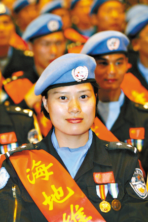 在這支防暴隊(duì)中,有7名女維和隊(duì)員受到了特別的關(guān)注,她們之中,有機(jī)關(guān)領(lǐng)導(dǎo),也有基層檢查員,還有醫(yī)生、護(hù)士;有的已結(jié)婚、有的已有了孩子,擁有幸福美滿的家庭,有的則剛剛走出大學(xué)校門。 第二次參加維和,被隊(duì)員們親切地稱為“大姐姐”的防暴隊(duì)首席聯(lián)絡(luò)官段中慧,總是那么和藹可親;被稱為“超女”的湯筱晶,不僅活躍于各種唱歌和拉歌場合,更是以腿長善跑而令不少男同胞們感到汗顏;有率真活潑“小女孩”張偉,是名副其實(shí)的神槍手;有傲視舞林的馬德芬,作為一名土家族姑娘,她優(yōu)美的舞姿和別具特色的民族舞蹈給全體隊(duì)員留下了深刻的印象;有白衣天使朝鮮族大姐孫花玉;有見人就說“笨豬(法語bonjour,你好!)”的戴紅,還有勇敢堅(jiān)強(qiáng)被親昵地稱為“小黑妹”的黃凌怡。
