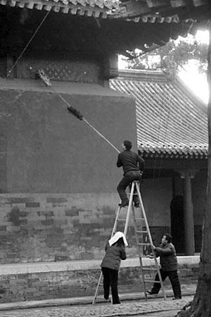 29日上午,記者進入孔廟,發(fā)現(xiàn)工作人員正在對大中門、東華門等附近游客出入必經(jīng)的磚鋪甬道進行精心修復處理。這些甬道都是由青磚鋪成,有的地方由于踩踏過多出現(xiàn)損毀或塌陷,工作人員都重新進行了仔細地鋪裝整理。在奎文閣、碑亭等處,工作人員用加長的雞毛撣子,拂去建筑墻體上的浮塵,使得古建筑更為鮮亮。