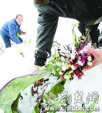 大雪給武漢市東西湖區(qū)蔬菜上市帶來(lái)不便。菜農(nóng)們每天下地在雪中搶摘蔬菜,既保證市場(chǎng)供應(yīng),又減少損失。