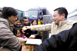 乳源縣委負(fù)責(zé)人在為受困群眾派發(fā)食物。