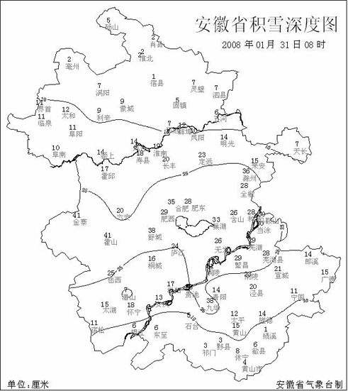 中新網(wǎng)1月31日電 據(jù)問(wèn)天網(wǎng)消息,安徽省氣象臺(tái)消息,截至今天早晨08時(shí),全省各地仍有積雪,其中沿淮到江南北部積雪深度普遍在10厘米以上,江淮中部和沿江東部超過(guò)25厘米,最深金寨、霍山為41厘米。