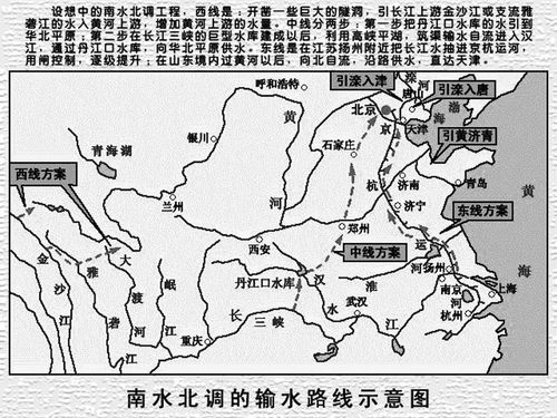 南水北調(diào)工程輸水示意圖。西線:開鑿一些巨大的隧洞,引長江上游金沙江或支流雅礱江的水入黃河上游,增加黃河上游的水量。中線分兩步:第一步把丹江口水庫的水引到華北平原;第二步在長江三峽的巨型水庫建成以后,利用高峽平湖,筑渠輸水自流進(jìn)入漢江,通過丹江口水庫,向華北平原供水。東線:在江蘇揚(yáng)州附近把長江水抽進(jìn)京杭運(yùn)河,用閘控制,逐級提升;在山東境內(nèi)過黃河以后,向北自流,沿路供水,直達(dá)天津。