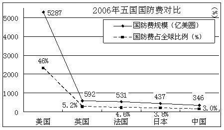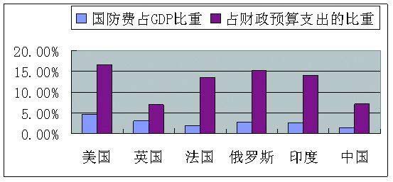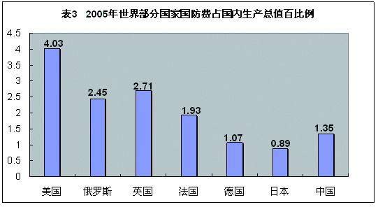 從絕對指標來看,以2004年為例,美國的國防費占全球國防費總開支的47%,日本占4.1%,而我國僅占2.4%。從相對指標看,美國國防開支占GDP的3.9%,我國是1.38%,其為我國的2.5倍。在國民人均國防費開支、每平方公里平均國防費等方面,我國在世界上均處于很低的水平。