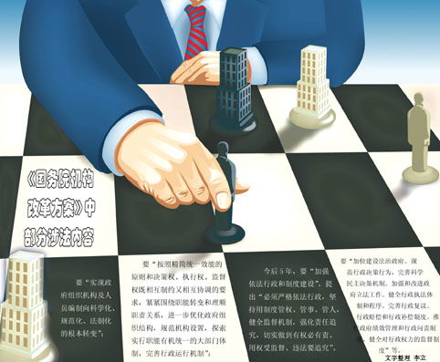 比如,要“實現(xiàn)政府組織機構(gòu)及人員編制向科學(xué)化、規(guī)范化、法制化的根本轉(zhuǎn)變”;要“按照精簡統(tǒng)一效能的原則和決策權(quán)、執(zhí)行權(quán)、監(jiān)督權(quán)既相互制約又相互協(xié)調(diào)的要求,緊緊圍繞職能轉(zhuǎn)變和理順職責(zé)關(guān)系,進一步優(yōu)化政府組織結(jié)構(gòu),規(guī)范機構(gòu)設(shè)置,探索實行職能有機統(tǒng)一的大部門體制,完善行政運行機制”……