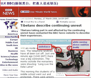 公安武警解救被襲漢族民眾,卻被說(shuō)成是在抓捕藏人;尼泊爾警察抓捕藏人抗議者,卻被說(shuō)成是“發(fā)生在西藏的新事件”;明明是寫(xiě)著“急救”字樣的救護(hù)車(chē),卻被描述成“在拉薩有很多軍隊(duì)”……