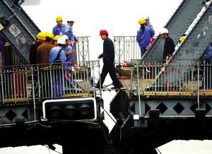 為保證外白渡橋移橋過程中橋梁結(jié)構(gòu)安全,移橋工作將分南、北兩跨分次進(jìn)行。今天上午先移除南跨橋體,明后天移除北跨橋體。昨天下午,負(fù)責(zé)“移橋”的千噸駁船已進(jìn)入金山路閘橋,?客獍锥蓸蛏嫌。今天上午9時(shí)10分,兩艘拖船將駁船拖至外白渡橋南跨橋體正下方,截至上午10時(shí),駁船已開始頂升橋體。