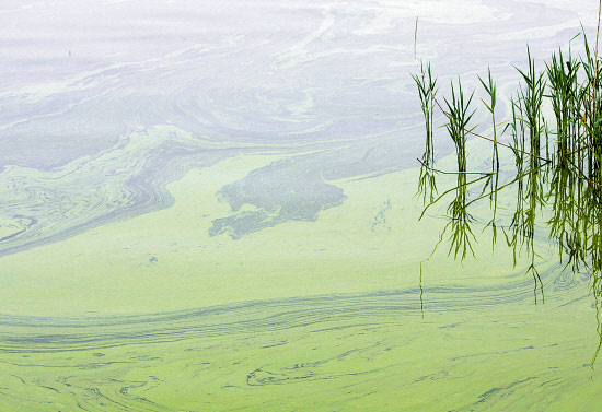 雖然經(jīng)過多日雨水的稀釋,但前日陽光下,湖州南太湖邊的水面上,一層綠膜仍泛著油光!斑@些就是藍(lán)藻!币晃粷O民告訴記者。