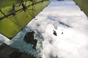 濃霧翻滾,時機(jī)稍縱即逝。指揮員果斷下令:“跳!跳!跳!”頓時,飛機(jī)尾門轟然張開,第一批7名隊員一躍而出!