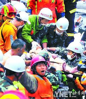 17日19時(shí)12分,在被6層水泥板壓了近125小時(shí)后,20歲小伙子蔣雨航在汶川地震震中映秀鎮(zhèn)獲救生還。這次搶救歷時(shí)9個(gè)多小時(shí),負(fù)責(zé)搶救的是前來支援災(zāi)區(qū)的上海市消防總隊(duì)救援隊(duì)。據(jù)在現(xiàn)場指揮救援的總隊(duì)長陳飛少將介紹,17日8時(shí)許,救援隊(duì)在映秀鎮(zhèn)映電賓館廢墟上喊話,搜尋幸存者,忽然聽到腳下有微弱的回應(yīng)。隊(duì)員急忙用“蛇眼”生命探測儀進(jìn)行探查,發(fā)現(xiàn)了被6層水泥板壓住的蔣雨航。簡單問了他的名字和身體狀況后,隊(duì)員們一邊與他對話,給他“打氣”,一邊小心翼翼地展開工程施救。