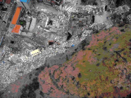 四川汶川8.0級(jí)強(qiáng)烈地震發(fā)生后,民政部國(guó)家減災(zāi)中心組建技術(shù)工作組趕赴四川地震災(zāi)區(qū)開展災(zāi)情評(píng)估工作。5月15日上午,工作組利用小型無(wú)人駕駛飛機(jī)在重災(zāi)縣北川進(jìn)行了航拍,共獲取北川縣城南部地區(qū)高清晰航拍照片與視頻影像。并與首都師范大學(xué)合作對(duì)數(shù)據(jù)進(jìn)行判讀。