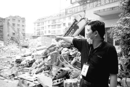 何淼告訴記者,從5月12日16時,接到抗震搶險指揮部下達的任務(wù)到5月17日的六個白天五個夜晚,他90%的時間都在這里。記者問他:搜救工作進展如何?他說:“都江堰市中醫(yī)院住院部除骨科、婦科病房沒有垮塌外,其余科室的病房全部毀損性倒塌,被埋醫(yī)護人員有32人,病員及看護家屬100多人,因為看護人員沒有在冊,所以傷亡的具體數(shù)字不十分準確,只能估計!
