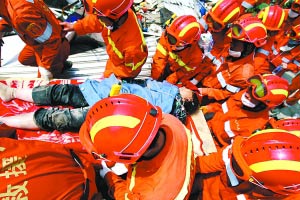 “是搜救犬最先發(fā)現(xiàn)的。”國家地震災(zāi)害緊急救援隊(duì)員杜國平回憶,昨日上午9時(shí)許,他和幾名同事在廢墟中拉網(wǎng)式搜索,突然,搜救犬“汪汪”叫起來,并且圍著廢墟中的一處轉(zhuǎn)圈。杜國平和同事立即對該處使用生命探測儀和聲波雷達(dá),的確有生命跡象。他們急忙叫來20多名隊(duì)員,用千斤頂、大力鉗將水泥預(yù)制板、鋼筋等拆除,發(fā)現(xiàn)一人被困在預(yù)制板和桌子擠壓形成的空隙中,身材比較胖,她的頭部露在外面。