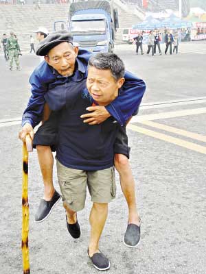 50歲的金光銀背著82歲的老父親金云才也來排隊(duì)。老人身體不好,腿腳不便,只有讓兒子背著走路。金光銀說:“政府都給我們安排好了,我們要轉(zhuǎn)移了。”