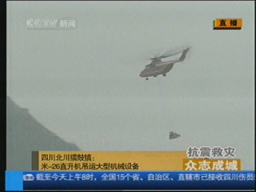 中新網(wǎng)綿陽5月26日電(霍潺)今天上午十一點零五分左右,一架紅色米-26直升機吊裝了一臺重約十三點二噸的重型挖掘機已起飛,前往唐家山堰塞湖壩體,大約二十多分鐘可以往返。