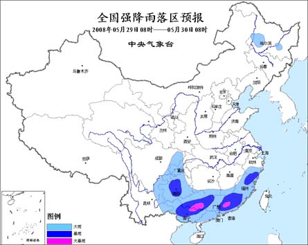 中新網(wǎng)5月29日電 據(jù)問天網(wǎng)消息,中央氣象臺今天早晨六點(diǎn)鐘發(fā)布暴雨預(yù)報(bào):