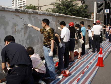 6月3日清晨的成都市繁華中心鹽市口國際商場圍墻邊,成都錦江區(qū)四大班子領(lǐng)導(dǎo)、機(jī)關(guān)干部、各街道辦黨政主要負(fù)責(zé)人在區(qū)委書記周思源和區(qū)長張濟(jì)環(huán)帶領(lǐng)下,正認(rèn)真地粉刷著圍墻。四川新聞網(wǎng)記者獲悉,作為清潔城市大行動的一個(gè)部分,錦江區(qū)將根據(jù)創(chuàng)建成都市最清潔城區(qū)的目標(biāo),從即日起在全區(qū)范圍內(nèi)展開粉刷圍墻行動。