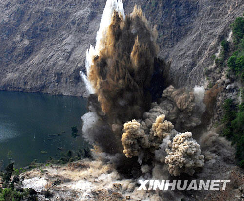 汶川地震發(fā)生后,青川縣青竹江石板溝一帶形成蓄水1200多萬立方米水的堰塞湖,威脅著下游數(shù)萬人安危,其中蓄水超過800萬立方米的石板溝堰塞湖被水利專家定為高危湖。隨著雨季來臨,高70多米的堤壩隨時都可能出現(xiàn)險情。為防止意外發(fā)生,武警水電三總隊(duì)對石板溝堰塞湖大壩實(shí)施了泄洪口爆破。