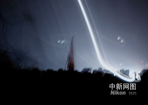 失事直升機(jī)部分遇難者遺體,由四川省軍區(qū)的阿壩軍分區(qū)和雅安軍分區(qū)預(yù)備役官兵日夜搶運。于十三日子夜零點時分先后運抵四川省映秀鎮(zhèn),圖為在映秀鎮(zhèn)外高山上出現(xiàn)運送隊伍的微弱燈光(右下角)。作者:賈國榮