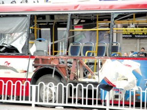 記者看到,公共汽車車體的一側(cè),在駕駛員后的位置,爆炸造成一個1.5米左右的裂口,部分座位變形,車體后部則完好無損,但車窗玻璃已全部爆碎,車體車窗玻璃及膠條最遠的飛出了10多米,附近全是玻璃碎片,數(shù)十名警察拉起了警戒線。