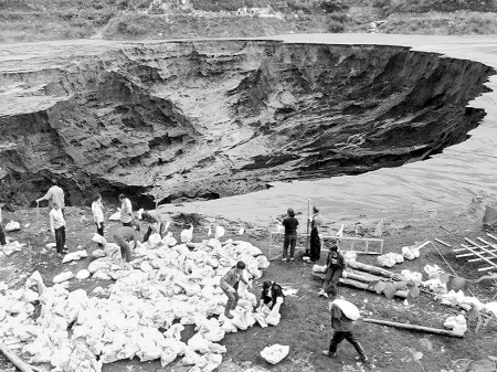 7月23日下午4時(shí)30分,記者趕到尾礦庫(kù)大壩上,商洛市市長(zhǎng)楊冠軍、常務(wù)副市長(zhǎng)楊長(zhǎng)亞、副市長(zhǎng)張文亮正在現(xiàn)場(chǎng)指揮搶險(xiǎn),百余名民工忙著扛運(yùn)沙袋,民警和搶險(xiǎn)人員身上系著繩子,將成捆的木材和裝有石塊的編織袋封堵坍陷區(qū)中心的泄漏口。尾礦庫(kù)壩下,幾臺(tái)大型機(jī)械正在河道里緊張清污。搶險(xiǎn)中,坍陷區(qū)面積仍在不斷擴(kuò)大,四周的尾礦不時(shí)出現(xiàn)滑塌,污黑的尾礦漿洶涌而下,發(fā)出一陣陣咆哮聲。
