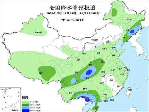 2008年8月12日8時(shí)-13日8時(shí)全國(guó)降水量預(yù)報(bào)圖