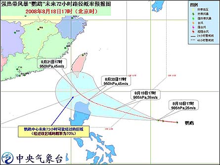預(yù)計(jì)強(qiáng)風(fēng)暴中心將以每小時(shí)20-25公里的速度向西偏北方向移動(dòng),強(qiáng)度繼續(xù)加強(qiáng),逐漸向臺(tái)灣東南部海面靠近。受其影響,19日白天,巴士海峽、巴林塘海峽、臺(tái)灣以東洋面的風(fēng)力將逐漸加大到6-8級(jí)。