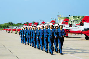 銀白色頭盔,天藍(lán)色飛行服,在紅白相間的戰(zhàn)鷹映襯下,整裝待發(fā)的女飛行學(xué)員顯得英姿颯爽!伴_車!”隨著指揮員、飛行大隊(duì)長孫光輝一聲令下,剎那間,發(fā)動機(jī)轟鳴震天撼地,戰(zhàn)鷹依次滑進(jìn)跑道,以雷霆萬鈞之勢直沖云天。